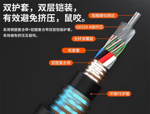 GYTA53光缆是一种双层铠装直埋式通信光缆,采用"金属铠装+PE护套"双重防护结构,专为复杂地形直埋敷设设计。具有优异的抗压、防潮、防啮齿动物破坏性能,广泛应用于城域网骨干线路、长途干线、军事通信等对可靠性要求极高的场景。