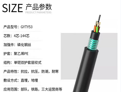 GYTY53光缆是一种采用双层钢带铠装结构的直埋式通信光缆,专为复杂地质环境和高机械强度需求场景设计。产品采用"钢带铠装+PE护套"双重防护结构,具有优异的抗压、防啮齿动物破坏性能,是干线网络、军事通信等高可靠性要求的优选方案。